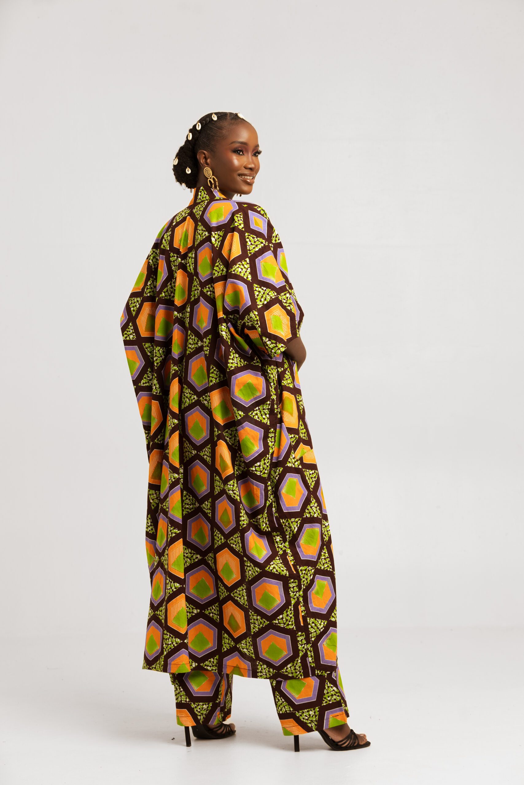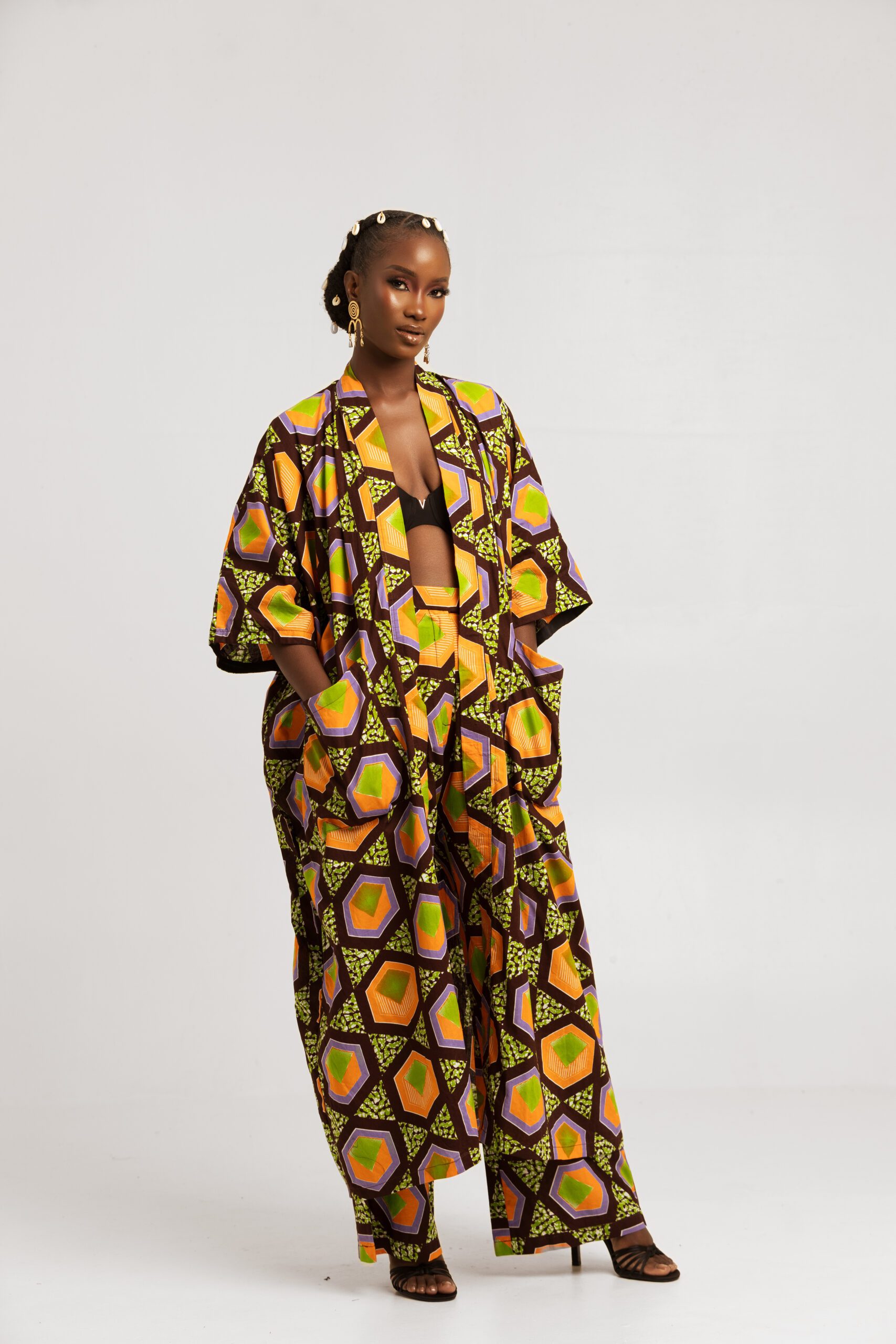 A big pocketed long kimono jacket that drapes to the floor. It can be worn with a crop top. This design is made with GTP NuStyle fabric. Perfect for brunch with the girls. (A matching two-piece set.)